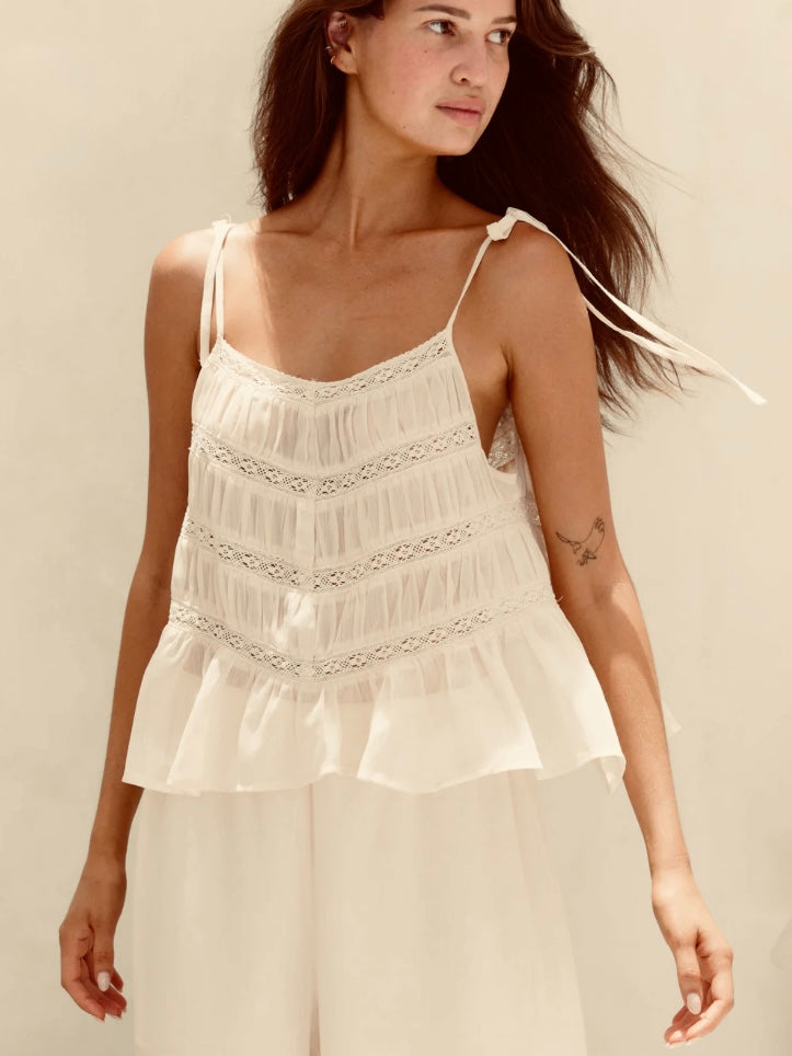 Mari Linen Ruffle Trim Top - Oatmeal