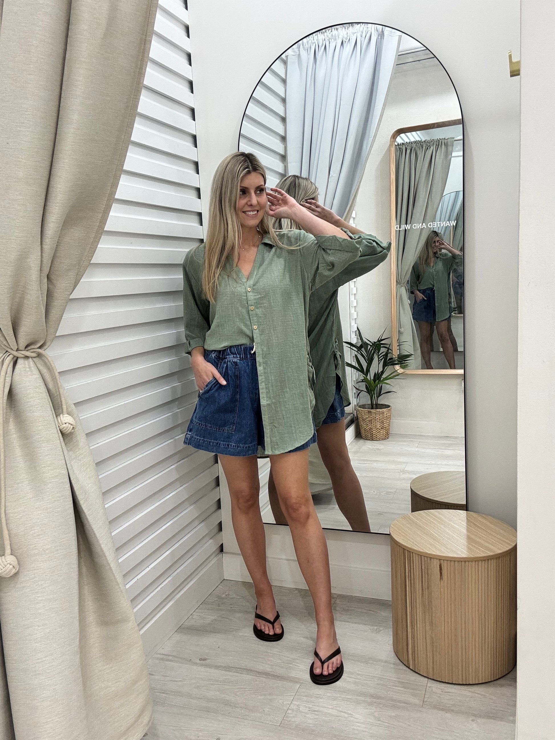 The Florence 3/4 Sleeve Shirt in soft khaki : made with a blend of 65% cotton and 35% polyester, available in sizes S/M (8-10) and M/L (10-12) and L/XL(14-16) Features include 3/4 length sleeves, wooden buttons, side ties, and an extra long length. Refer to the size guide for reference, modeled here in a S/M.