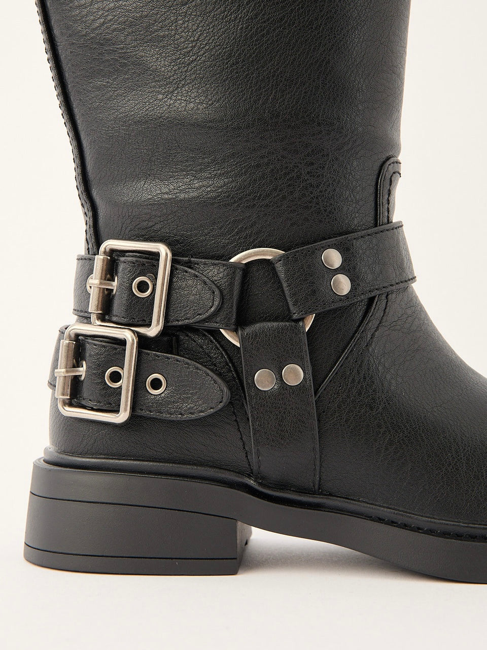 Step into your bold era with the Kaylen Boots by Billini — a statement-making motorcycle boot designed for winter layering, effortless edge, and everyday confidence. Featuring bold buckle detailing and a chunky sole, these knee-high boots bring attitude to every step. Style them with oversized coats, mini skirts, or layered knits for an off-duty look with major impact.