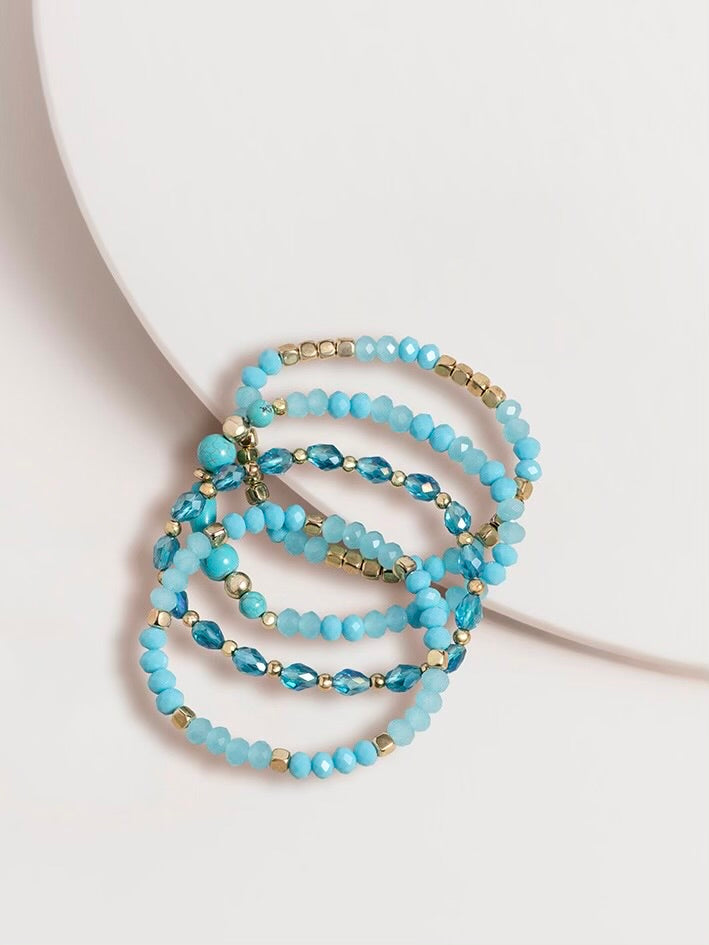 The Miami 4 Piece Jumble Bracelet set features a relaxed mix of beaded and corded styles in turquoise tones, gold accents, and natural textures. Designed to be worn together or mixed with other favourites, this easygoing set is all about carefree, layered style.