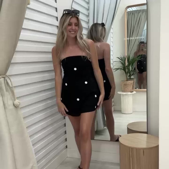 Get ready to take on the day in style with the Polka Dot Set by Frankie in classic Black and White. Made from comfy cotton, this set features a sassy strapless top and playful shorts. Find it at Wanted and Wild, in sizes XS to XL. So go ahead, make a statement with this must-have outfit!
