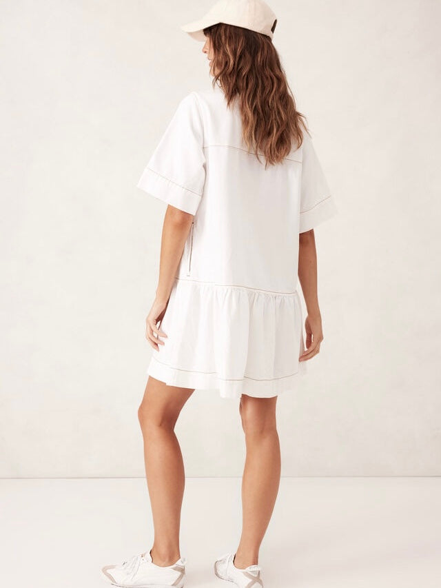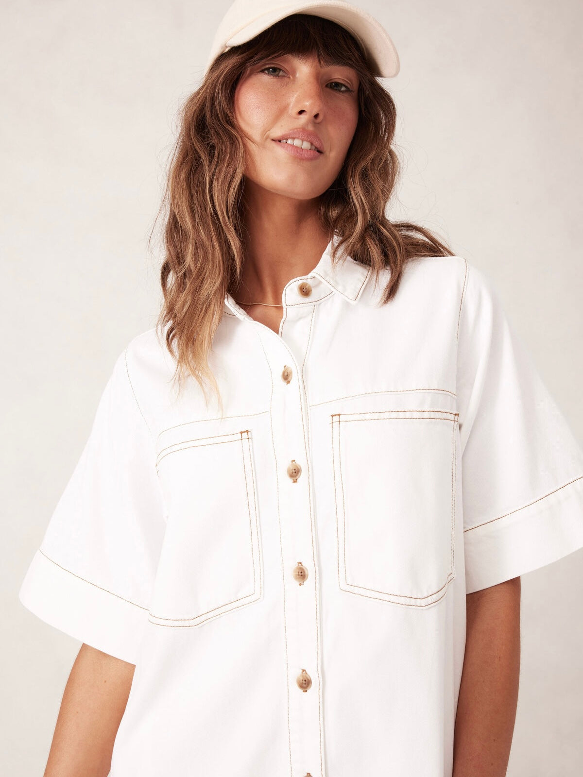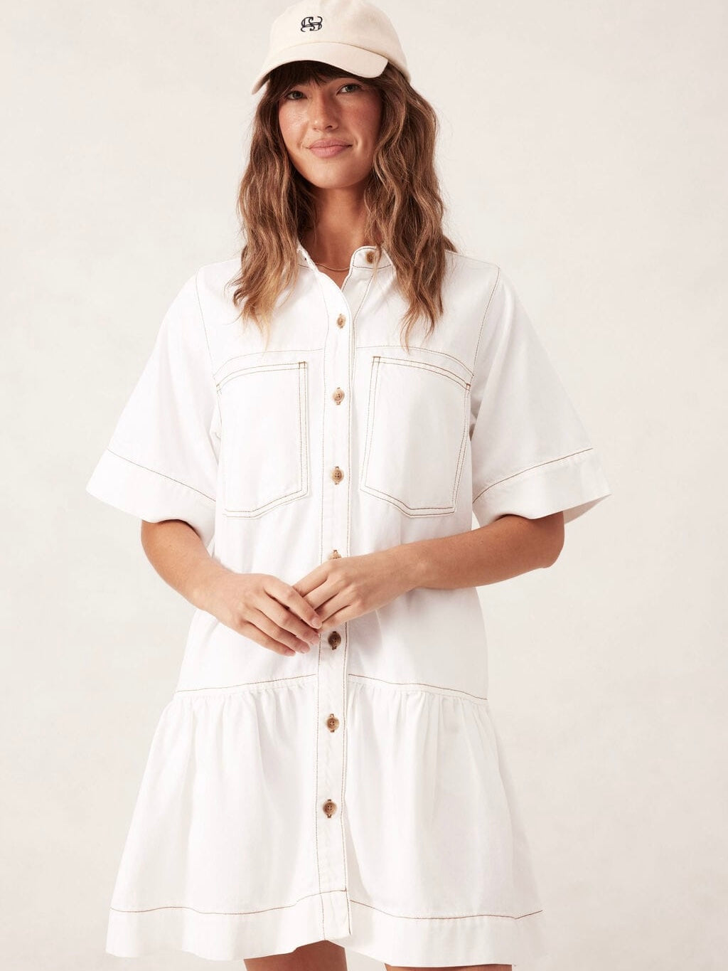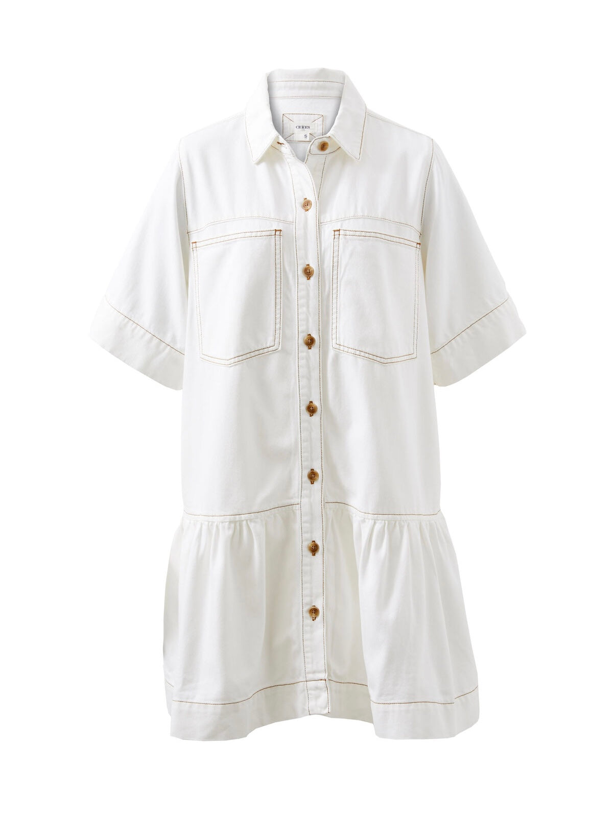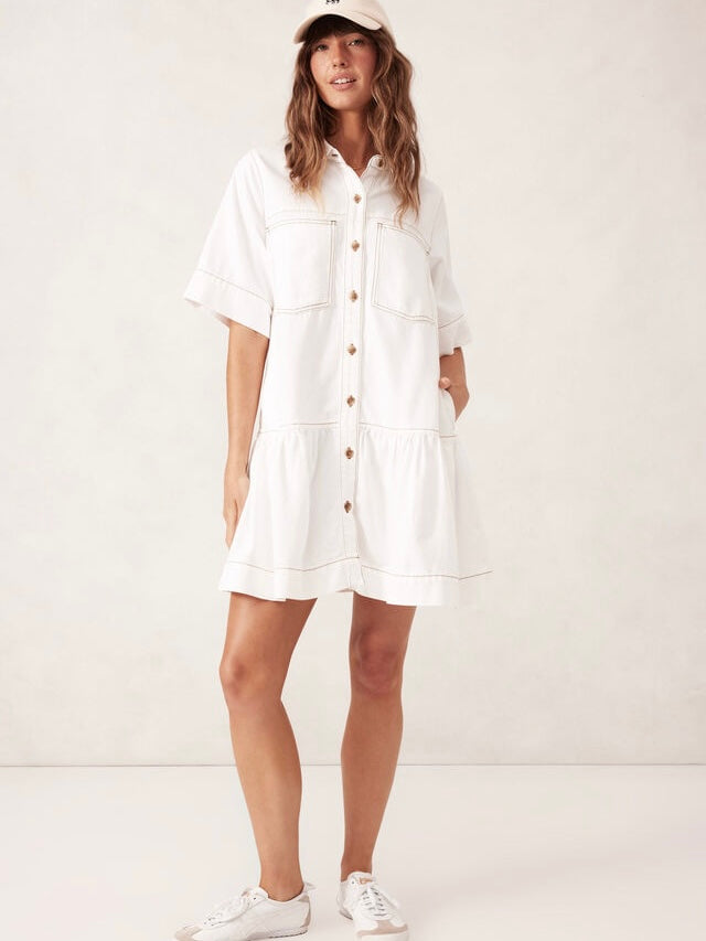 Short Sleeve Tiered Pocket Denim Dress - Fresh Ecru
