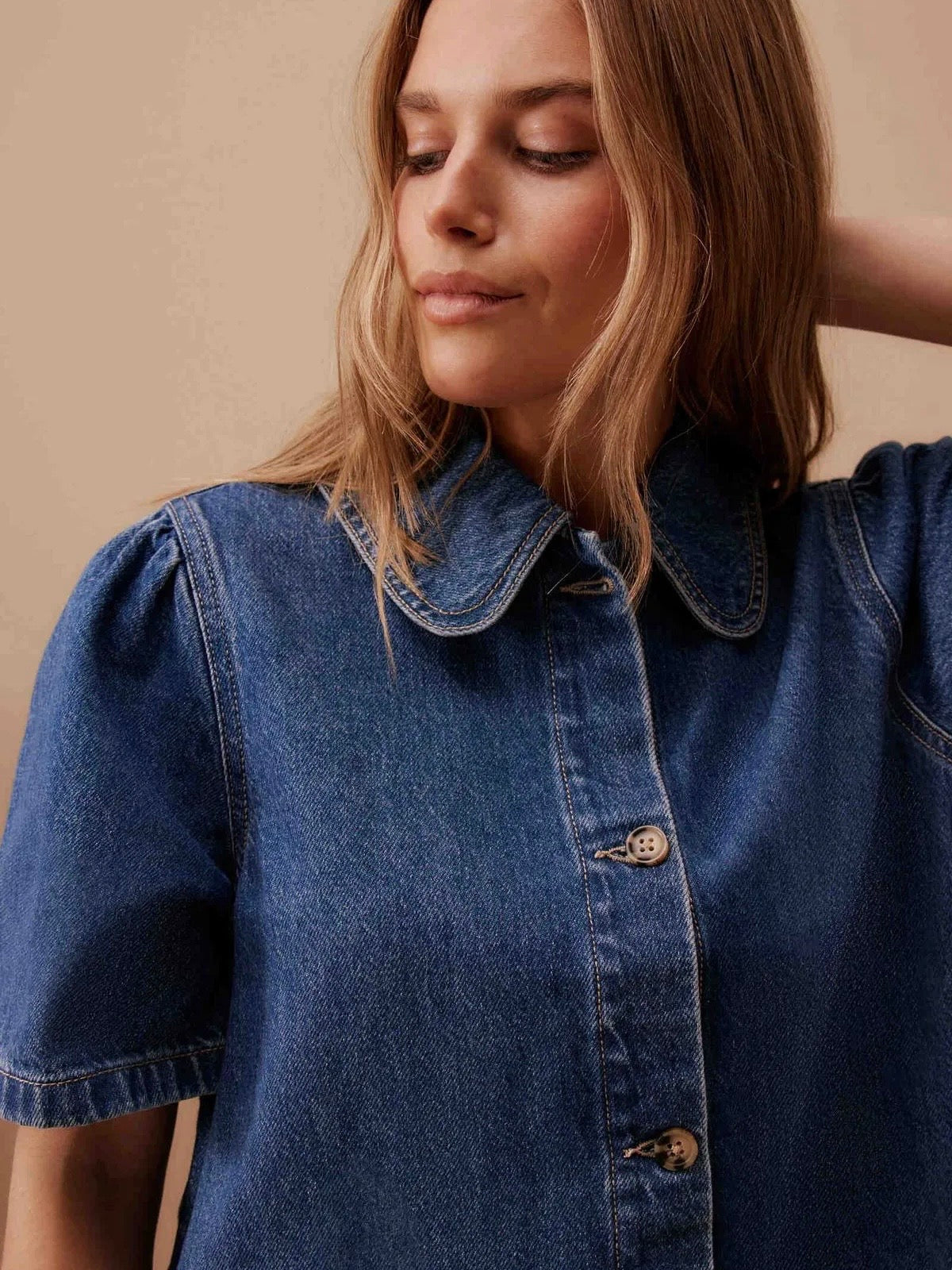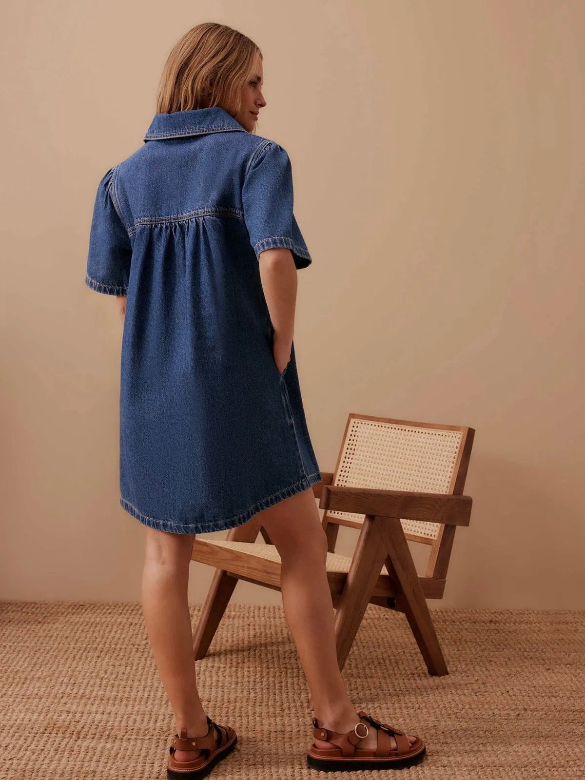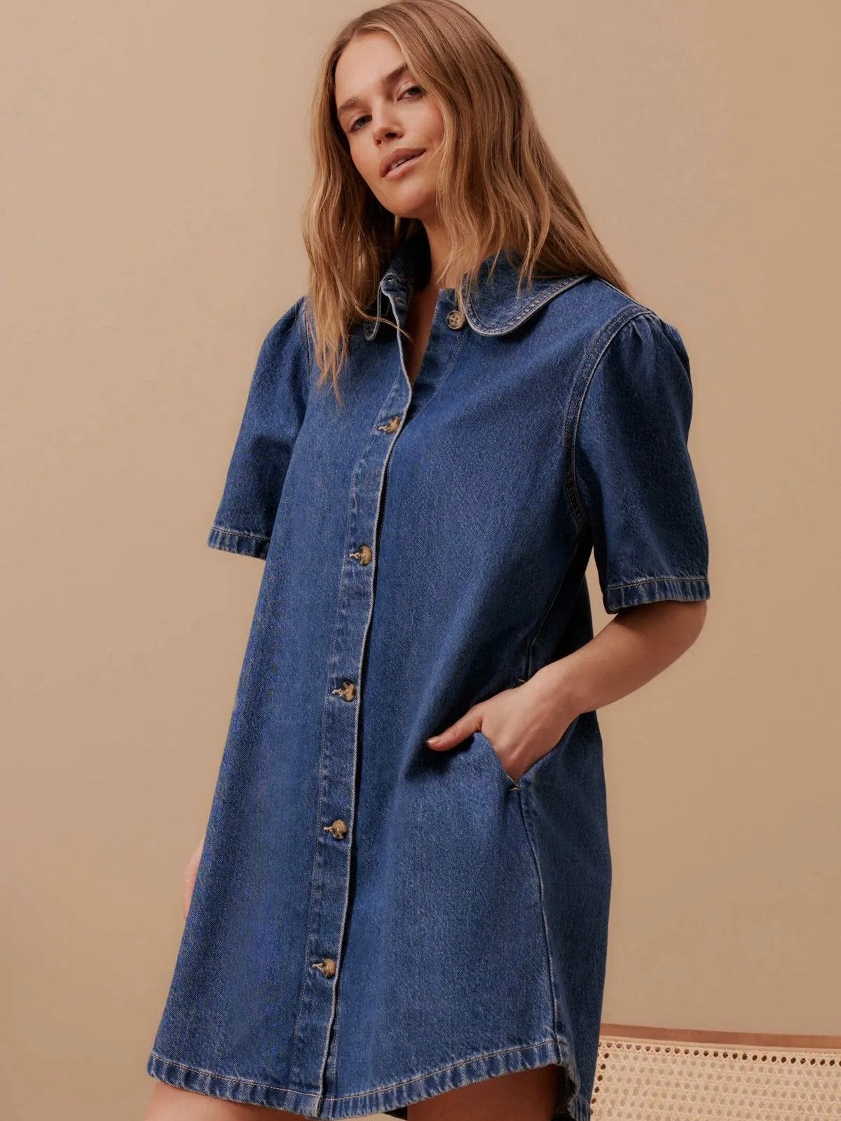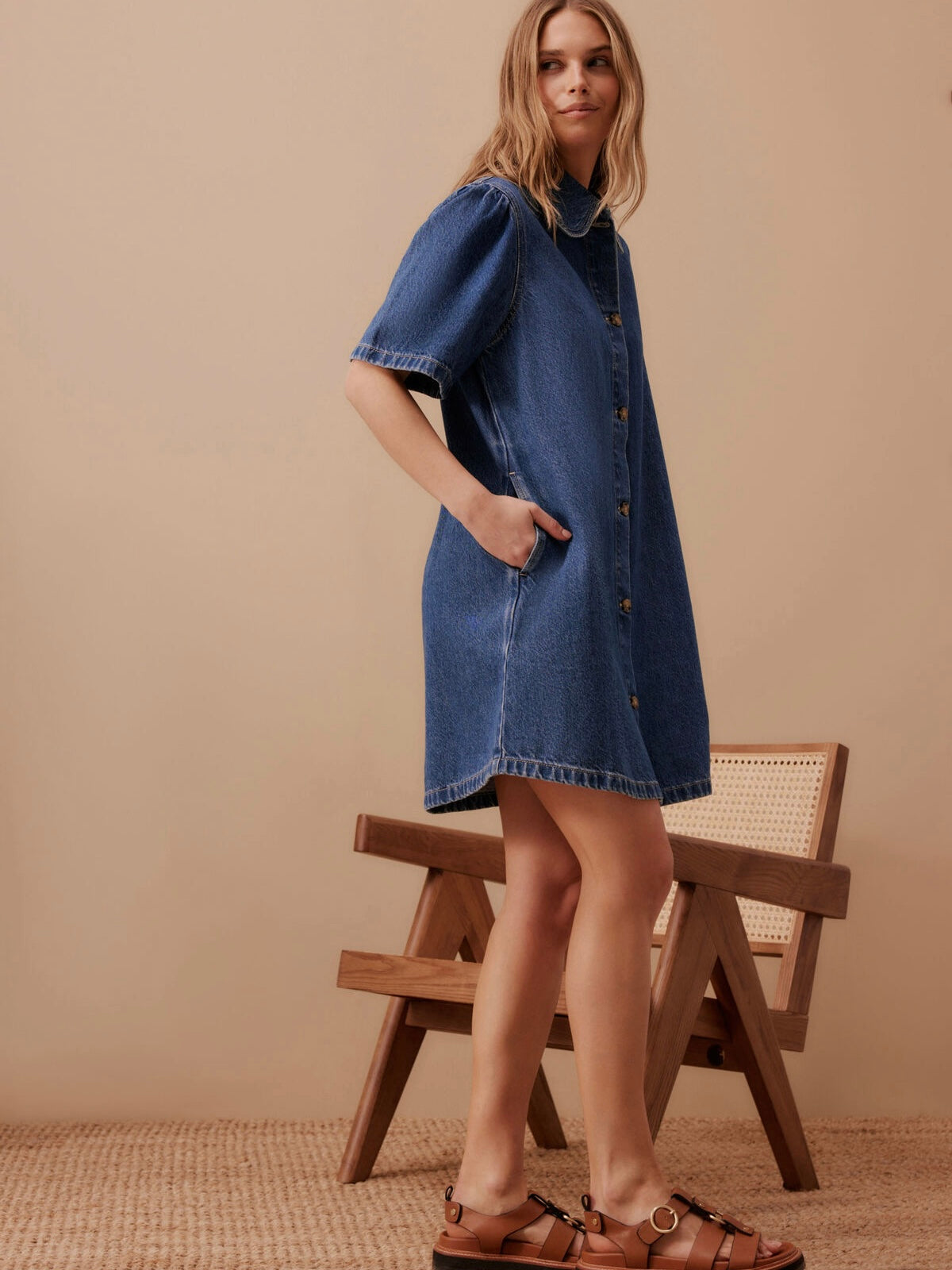 The Sienna Denim Dress is the perfect balance of timeless denim charm and modern ease. Crafted from 11.2 oz mid-weight rigid denim, made with 100% organic cotton, this mini dress feels structured yet relaxed on the body. A rounded collar lends a touch of polish, while discreet side-seam pockets add everyday practicality. Designed with a laid-back silhouette, it’s your new throw-on-and-go piece for instant chic.