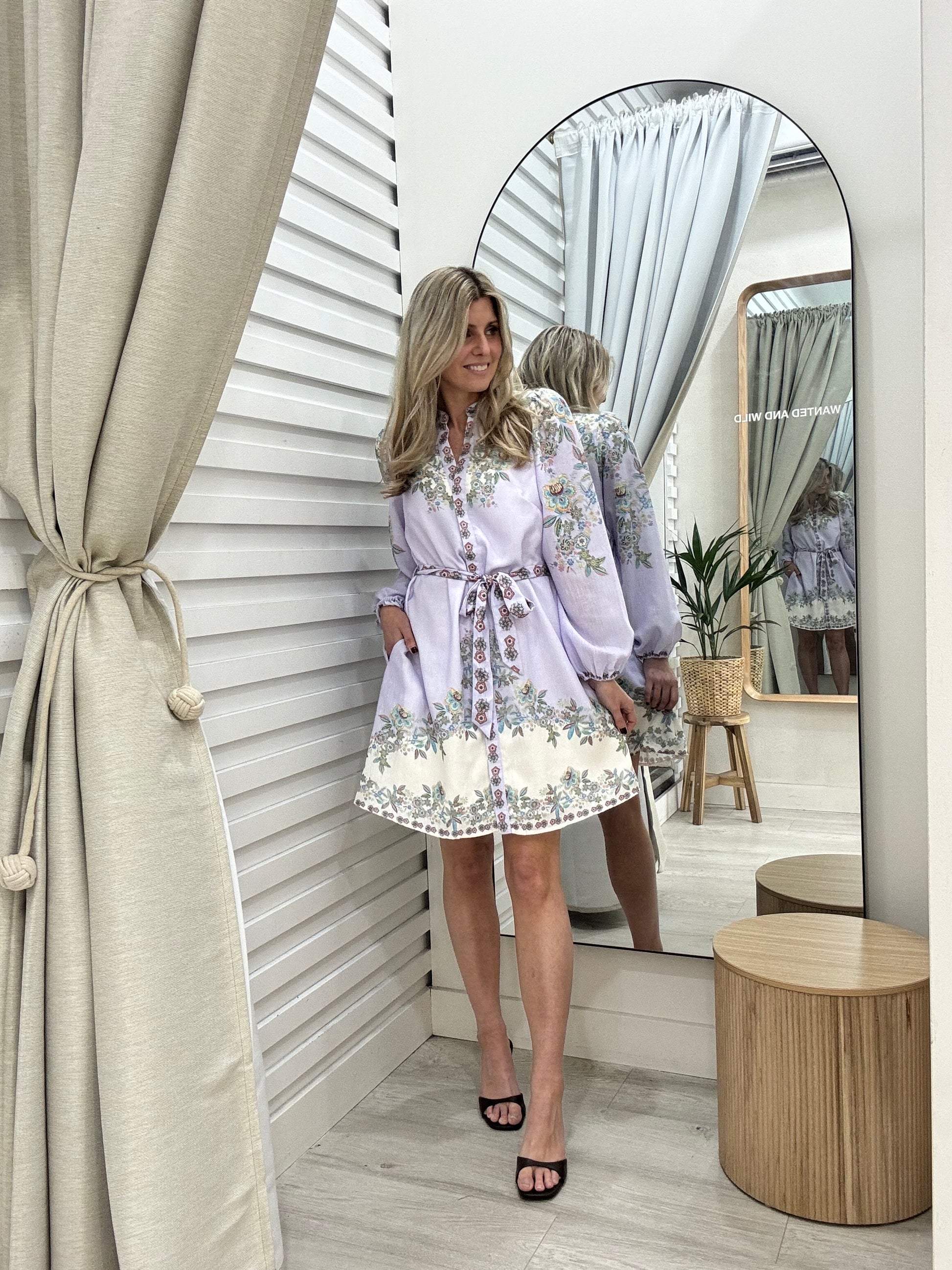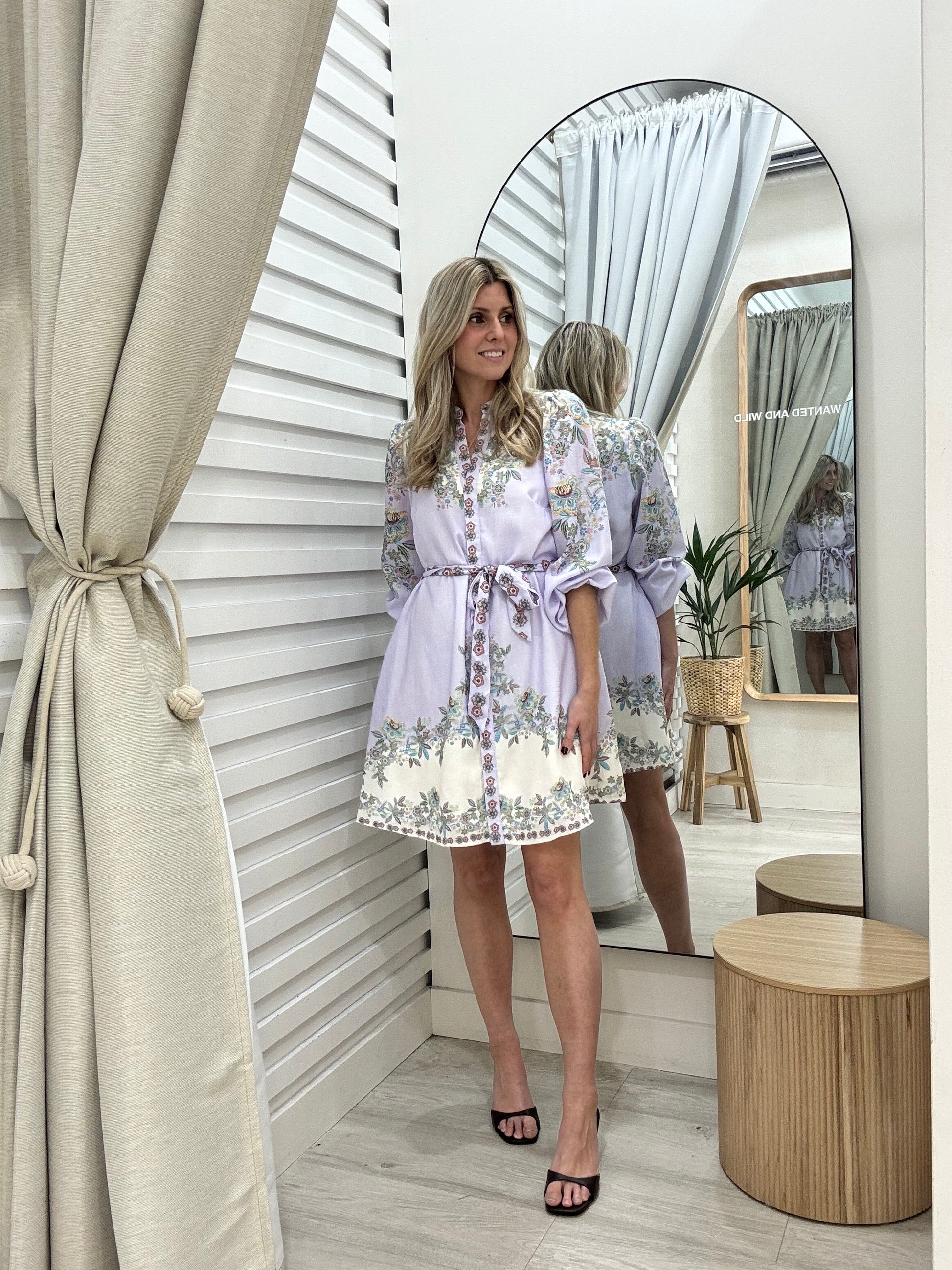 Turn heads in The Bluebell Dress in Lilac – a fresh take on timeless femininity. Crafted in a structured shirt-dress silhouette with long sleeves and a collared neckline, this piece features exquisite floral embroidery in soft pastel tones, creating an elevated day-to-night look. The tie waist cinches beautifully, flattering the figure while keeping things effortlessly wearable. Whether you’re brunching with the girls or styling up for a boutique event, the Bluebell Dress delivers easy elegance with a playful twist.