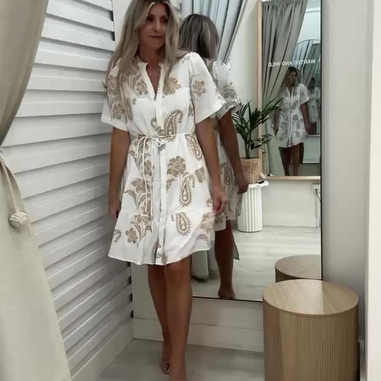 Meet The Cara Dress - White with Beige embroidered floral, the ultimate addition to your wardrobe for effortlessly chic style! With a playful sky blue and white floral print, this dress is sure to turn heads. it boasts cute cap sleeves and a flattering waist tie for a customizable fit. And with a knee-length cut, it's perfect for any occasion. Available in sizes 6-16 for a perfect fit every time.