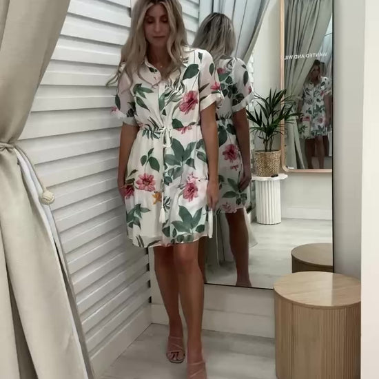 Introducing The Coral Dress - Multi Floral: your new must-have for effortless style! This charming dress showcases a striking, verdant green, white, and pink floral print that's sure to catch attention. Made from a soft blend of cotton and polyester, it features quirky balloon sleeves and a flattering waist tie for a unique silhouette. The versatile knee-length design is suitable for any event. Available in sizes 6-16 with standard sizing. Keep it looking vibrant with a gentle cycle wash. Experience pure delight in dress form!