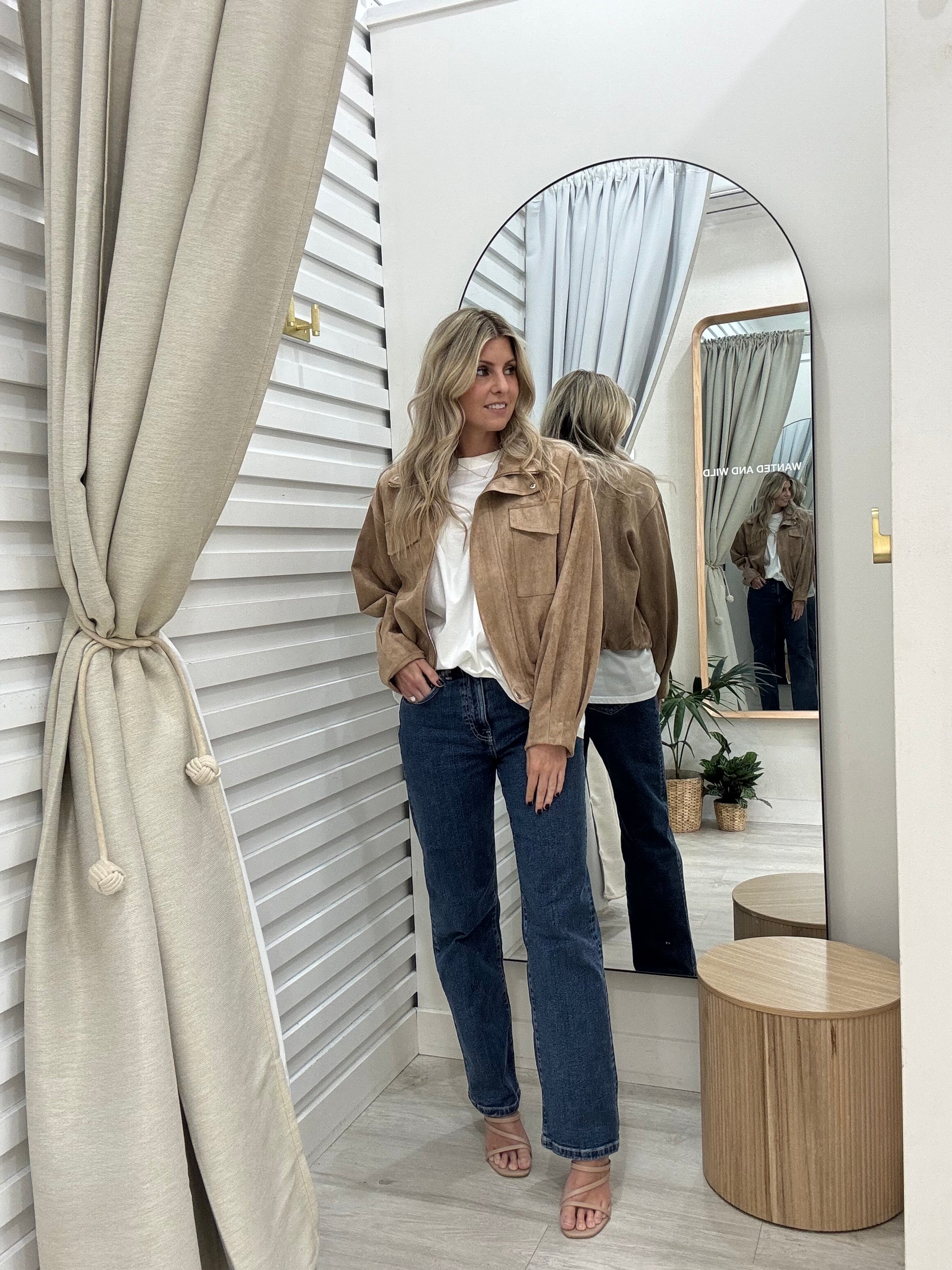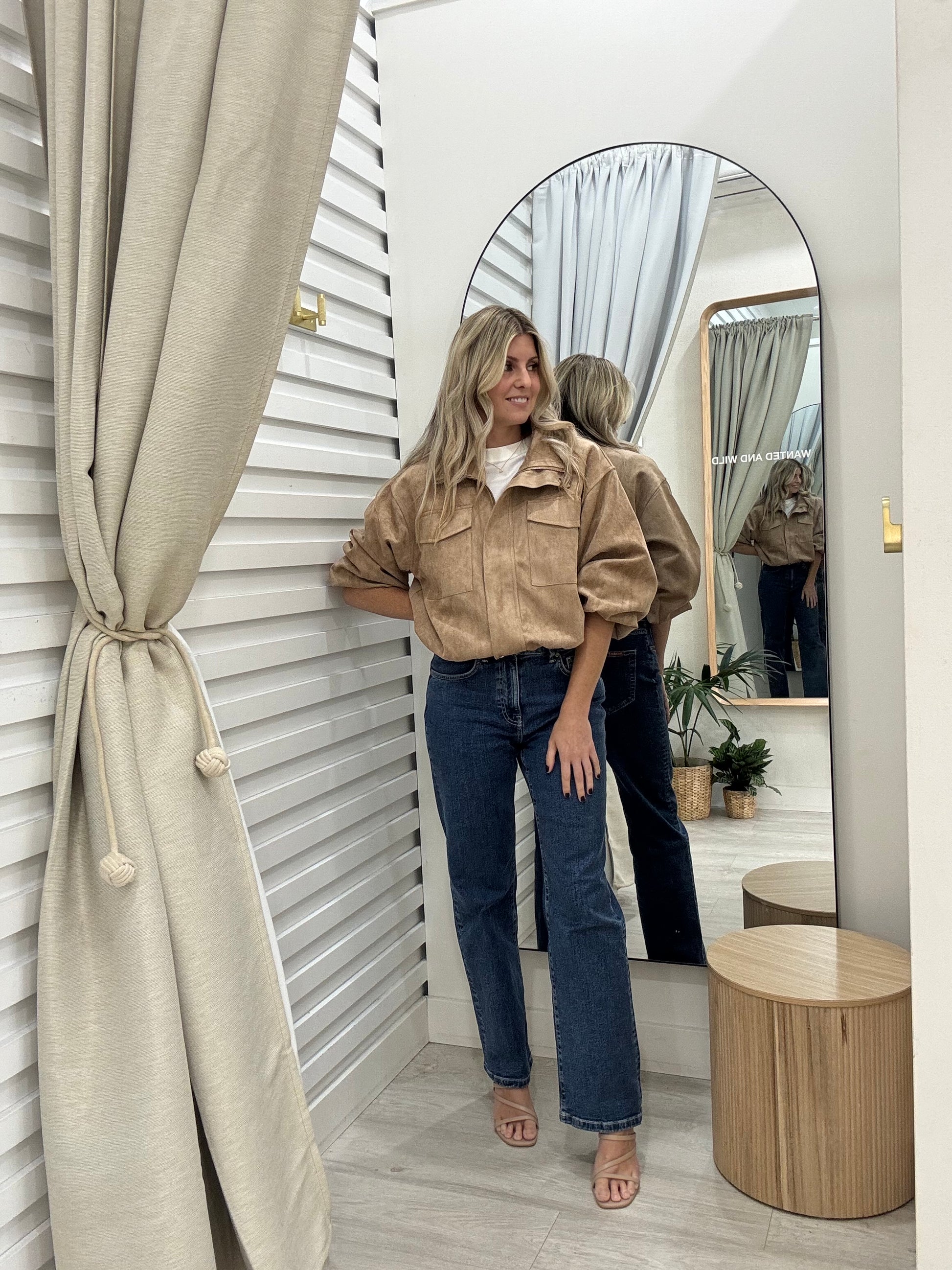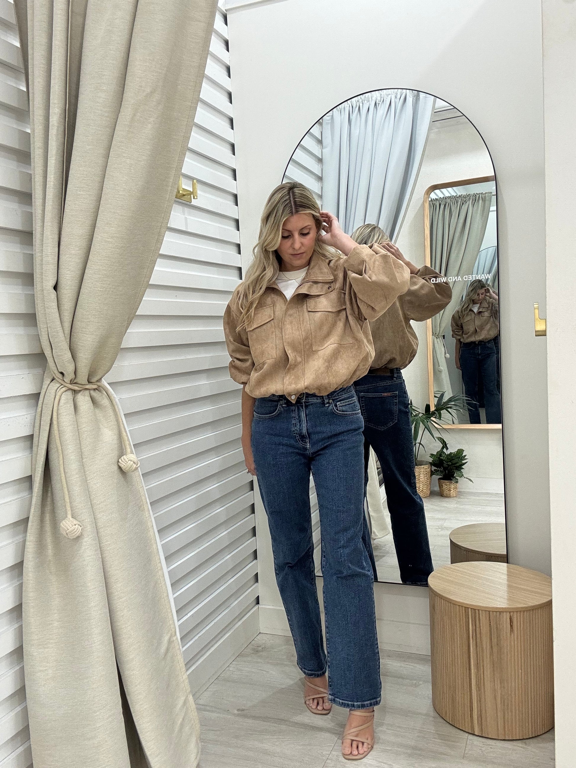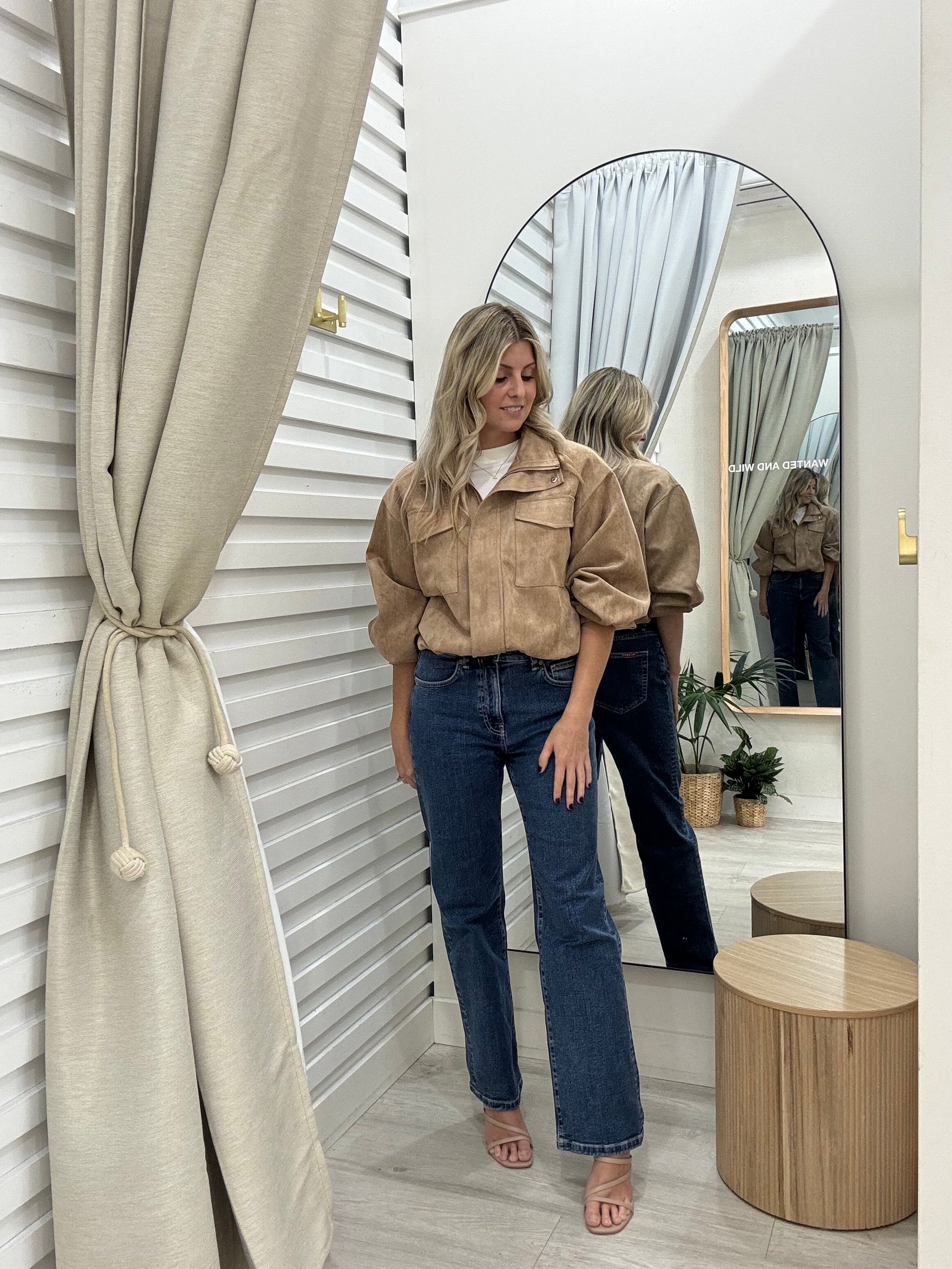 Crafted in a soft suede-look fabrication, this jacket features a statement high neckline, zip front closure, oversized fit and utility-inspired front pockets. The versatile beige tone makes styling easy — pair it with denim and a basic tee for everyday chic, or layer over knitwear for a refined winter look.