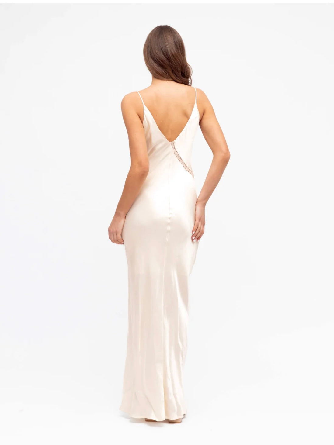 The Lace Slip Dress in Champagne is an elegant bias cut slip dress with a lace insert on a diagonal across the bust.