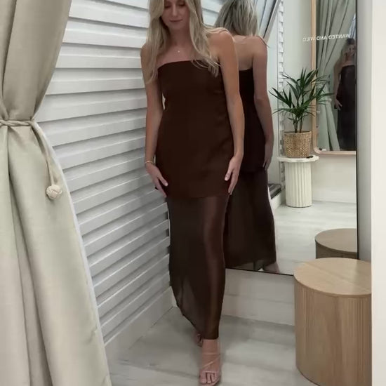 Meet The Lacey Set — your new modern-romantic two-piece that blends effortless elegance with a soft, feminine silhouette. Designed in your choice of Buttercup, a soft pastel yellow, or Chocolate, a warm earthy neutral, this set features a structured bandeau-inspired top with a fluid overlay and matching wide-leg sheer pants that move beautifully with every step.