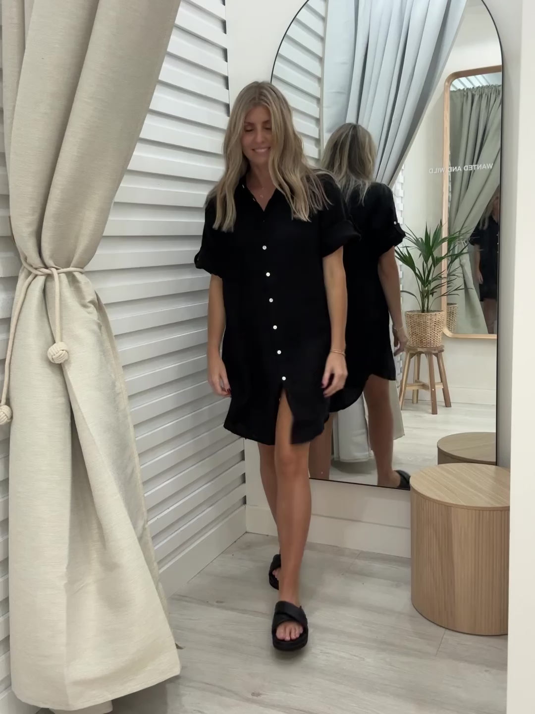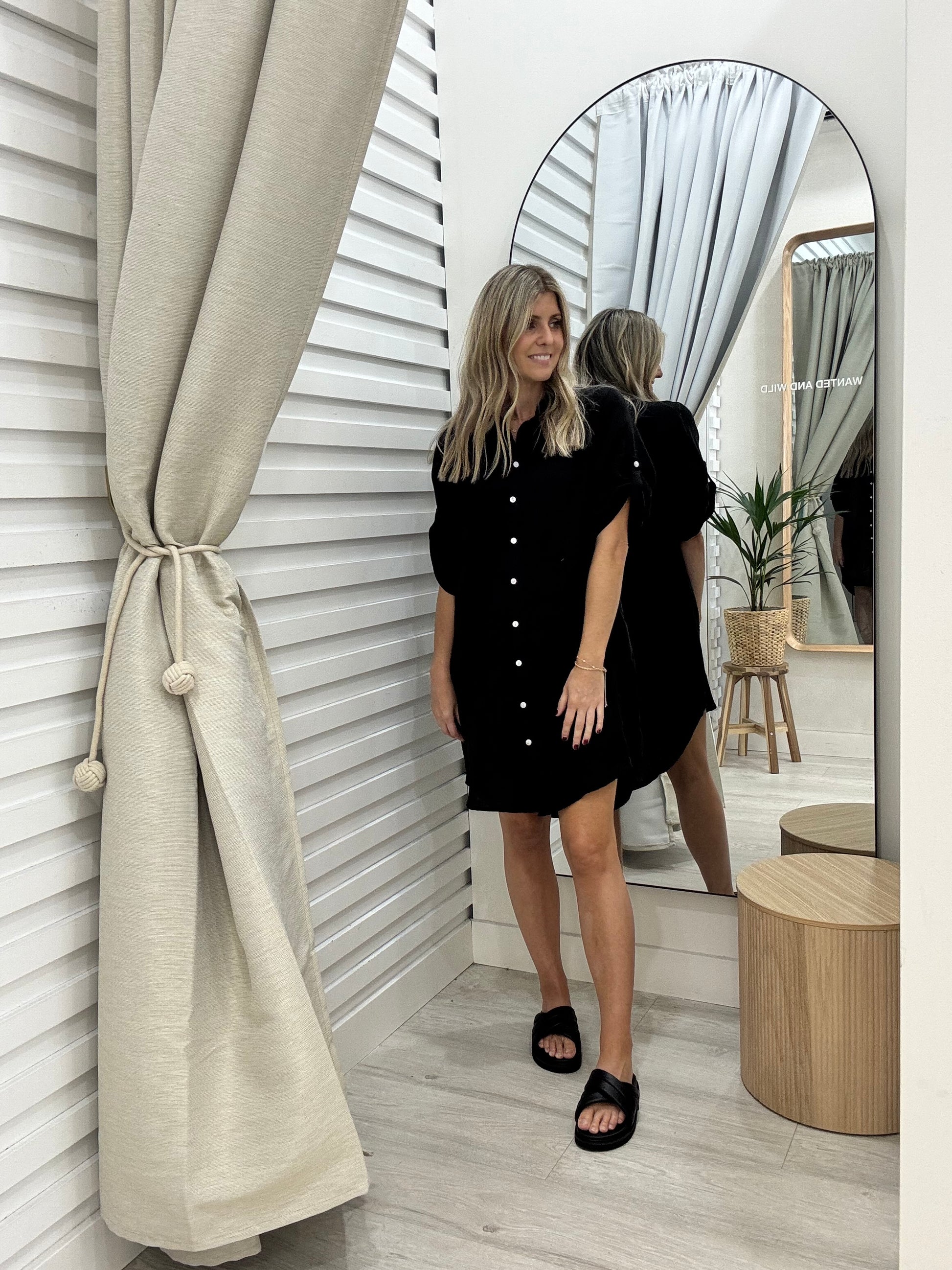Elevate your wardrobe with the Lune Linen Shirt Dress in Black, a timeless and versatile piece designed for effortless style and comfort. Crafted from premium linen fabric, this dress offers breathability and a relaxed yet sophisticated silhouette, making it perfect for all seasons.