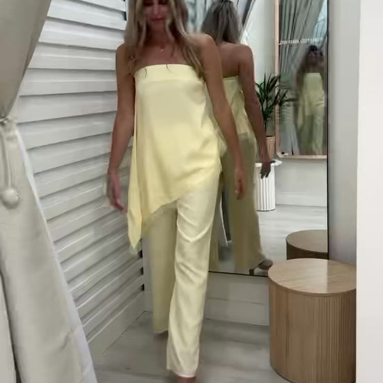 Introducing the Maeve Pants Set in yellow – your new go-to for effortless style! This cheeky two-piece features a flirty strapless top with an asymmetrical lace trim hemline, that'll turn heads, paired with comfy elastic-waist pants complete with functional pockets (because who doesn't love pockets?). This set works beautifully together or mix-and-match with your existing wardrobe. Available in sizes XS-XL with standard sizing. Sold as a complete set – double the outfit options, zero regrets!