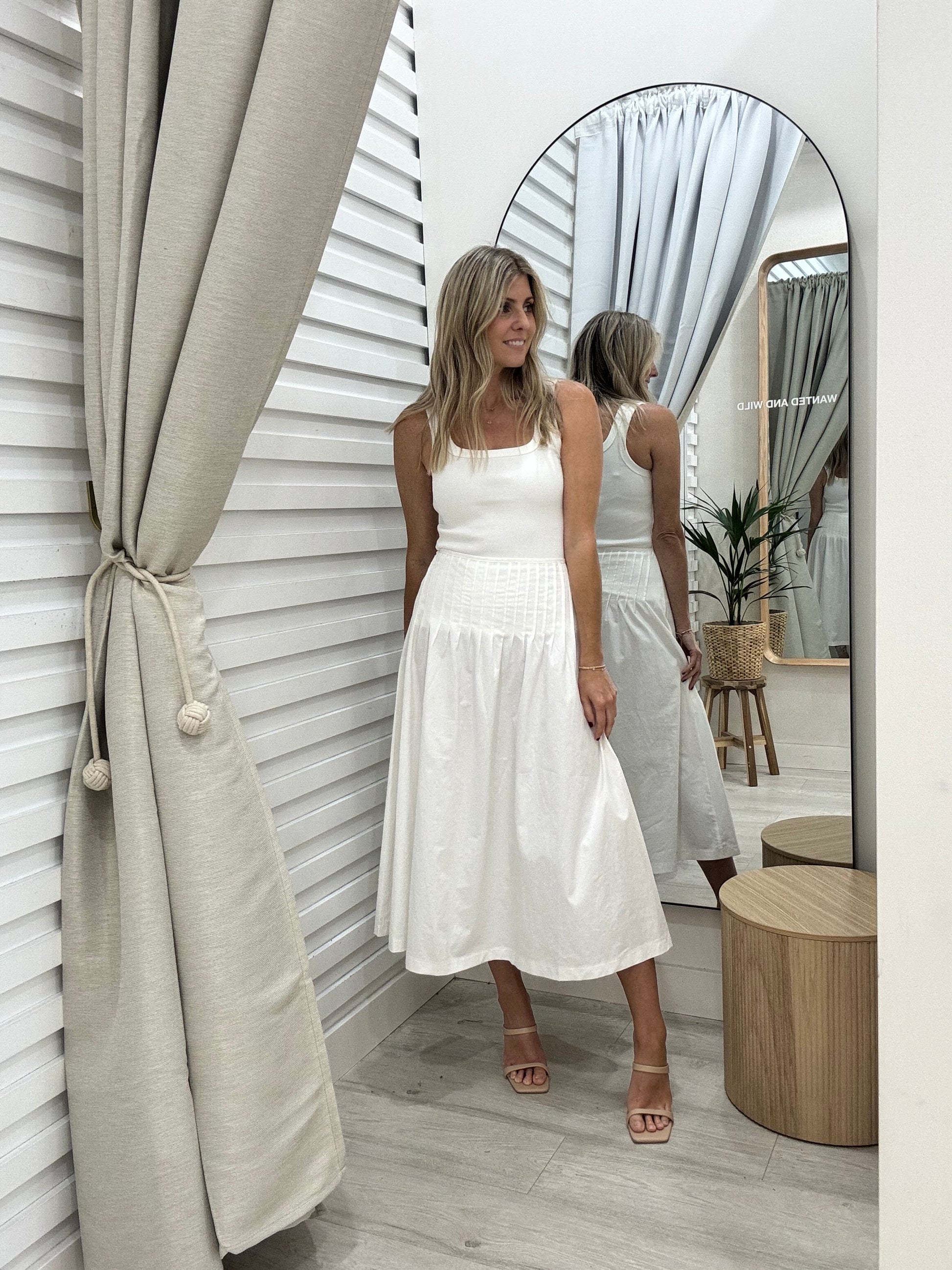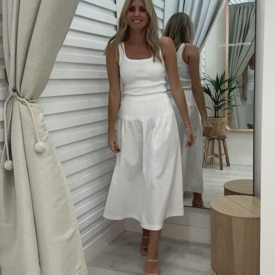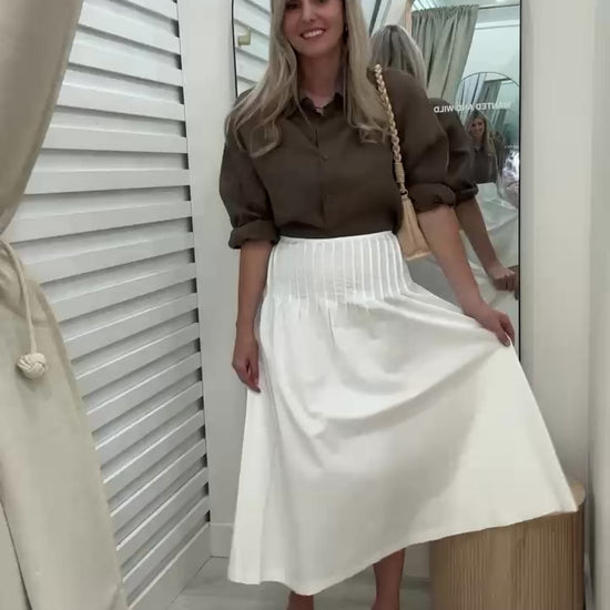 An elegant staple reimagined for modern dressing. The Morgan Midi Skirt features soft, fluid pleats on the waistband that fall beautifully to a midi length, creating effortless movement with every step. Designed with a comfortable waistband and lightweight fabrication, it’s the perfect balance of polish and ease.