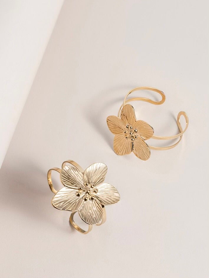 The Peace Gold Flower Cuff Bangle features a sleek open cuff design with a central floral motif. With its polished gold-tone finish and feminine detail, it’s a refined statement that works for both casual and elevated looks.