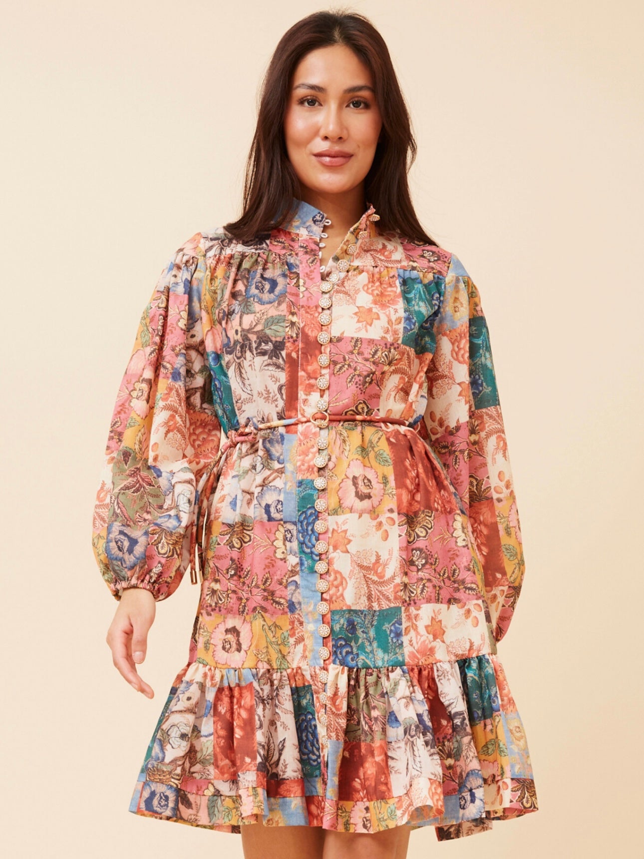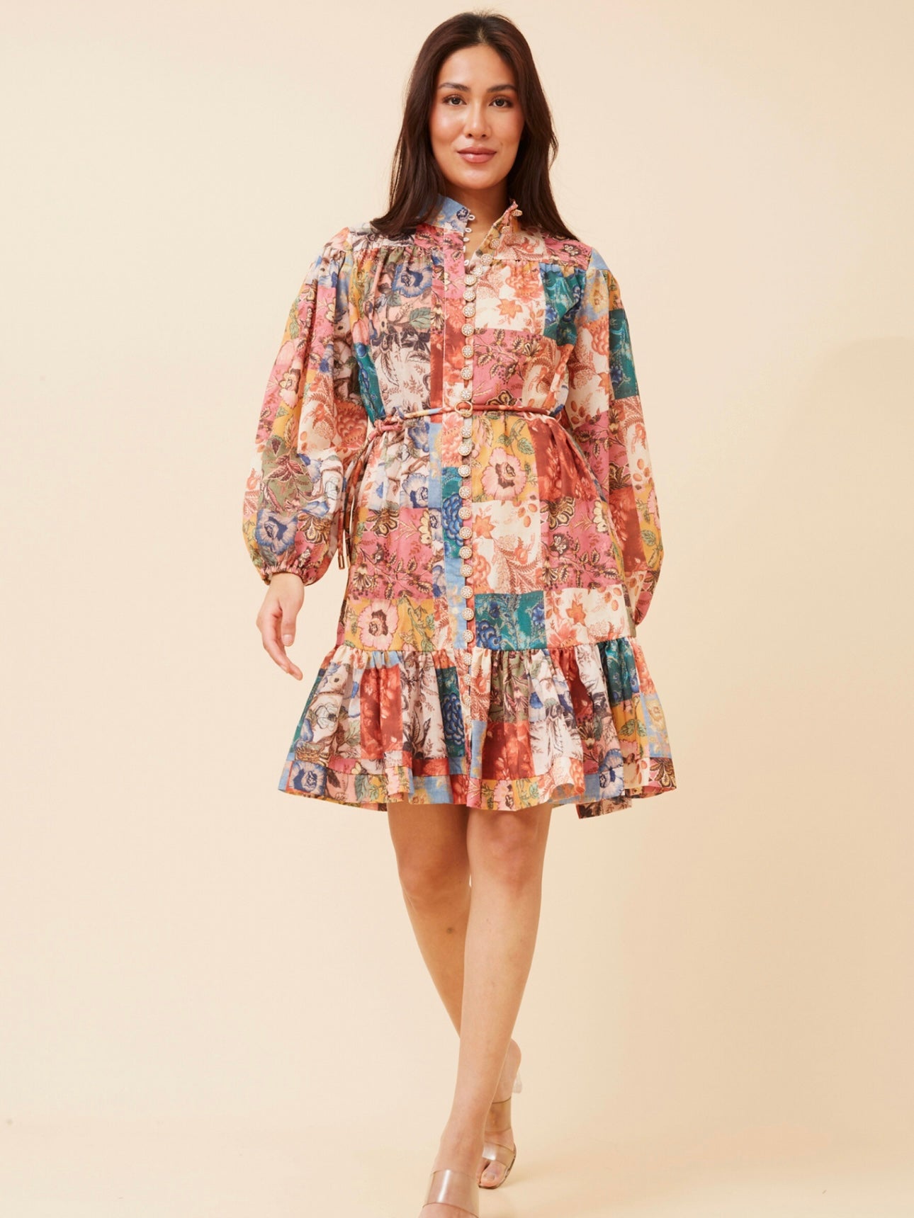 The Verona Patchwork Dress is designed for the woman who loves bold prints with a luxe edge. Crafted in a vibrant patchwork of florals and painterly motifs, this mini dress is the perfect blend of playful and polished. Featuring a relaxed silhouette, soft balloon sleeves, and a tiered hemline for added movement, it’s finished with delicate button detailing and a self-tie belt to cinch the waist. Lightweight and versatile, it’s a piece that transitions seamlessly from day to night.