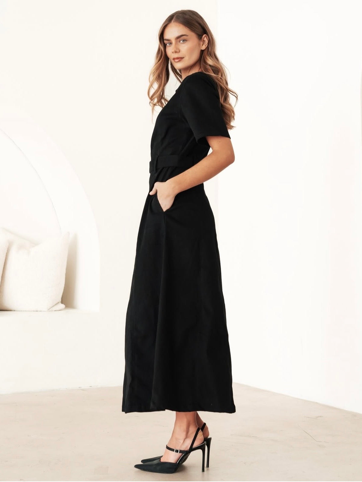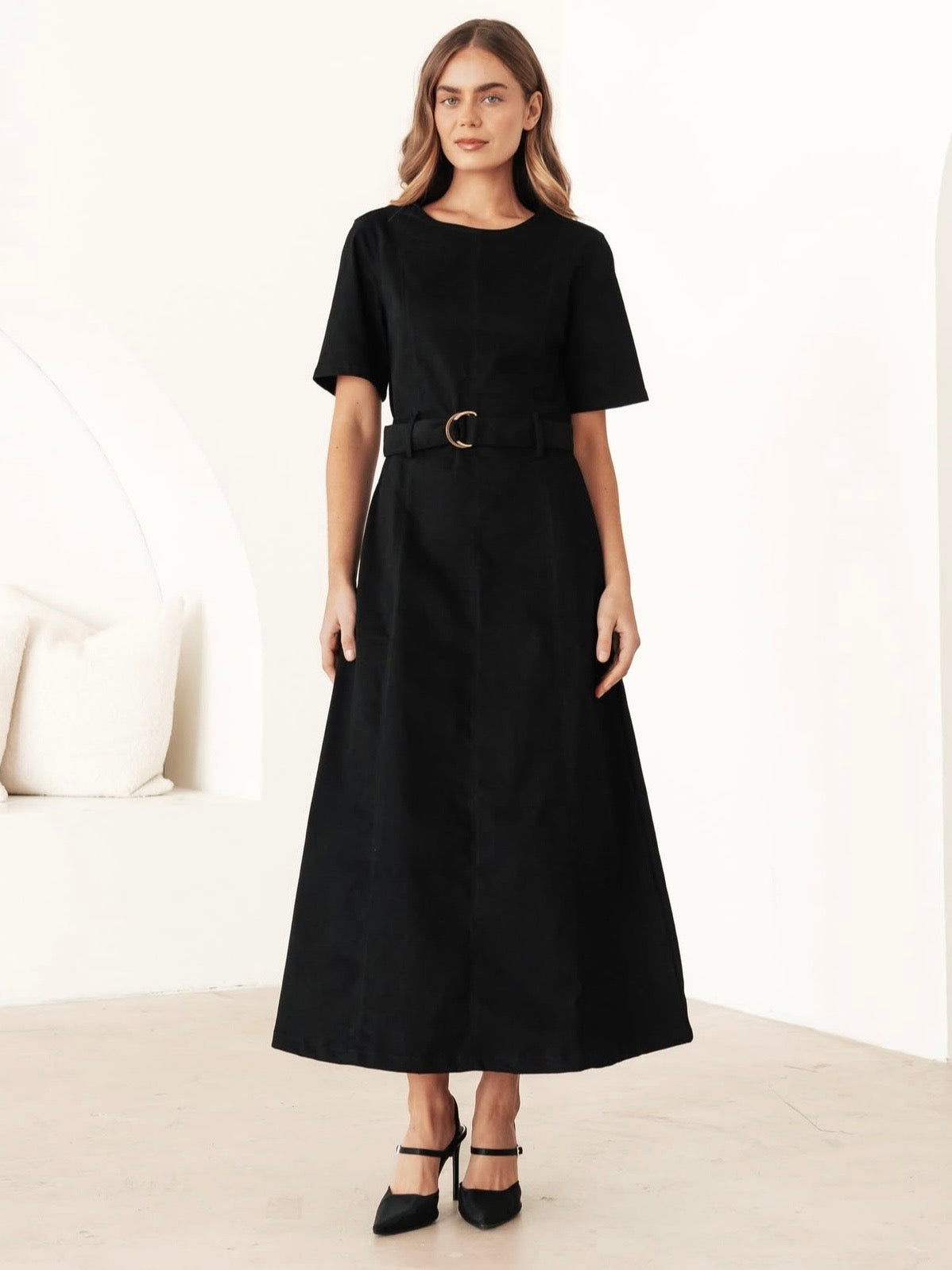 Elevated, timeless, and effortlessly chic – The Zara Maxi Dress in Black is the ultimate wardrobe essential for refined dressing with a modern edge. Crafted in a structured cotton-linen blend, this full-length silhouette features a sculpted waist with a statement belt, clean lines, and minimalist elegance.